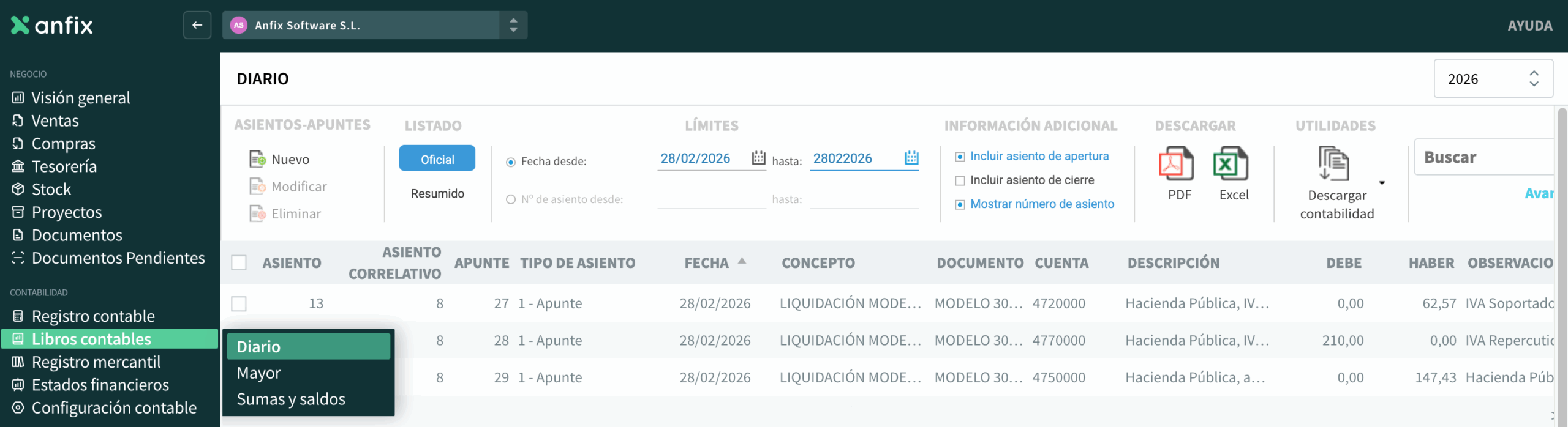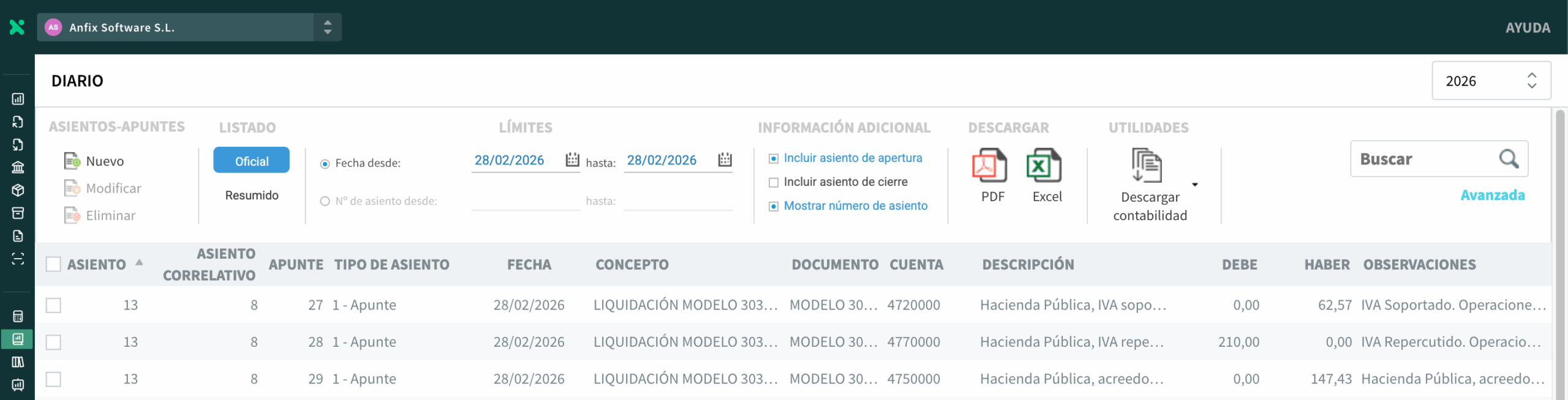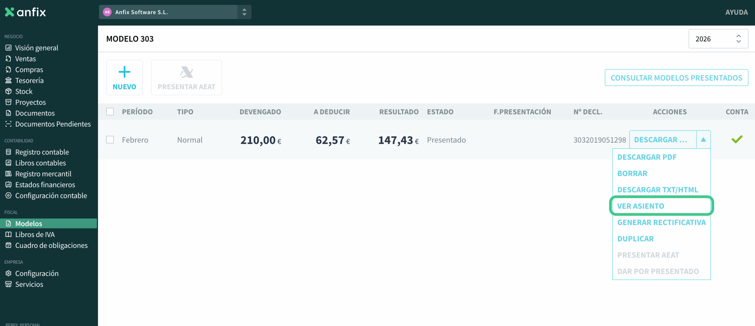 Después de presentar un modelo de impuestos, puedes generar el asiento contable de su liquidación desde Anfix. Esta opción está disponible en los modelos 303, 111, 115, 130 y 202.