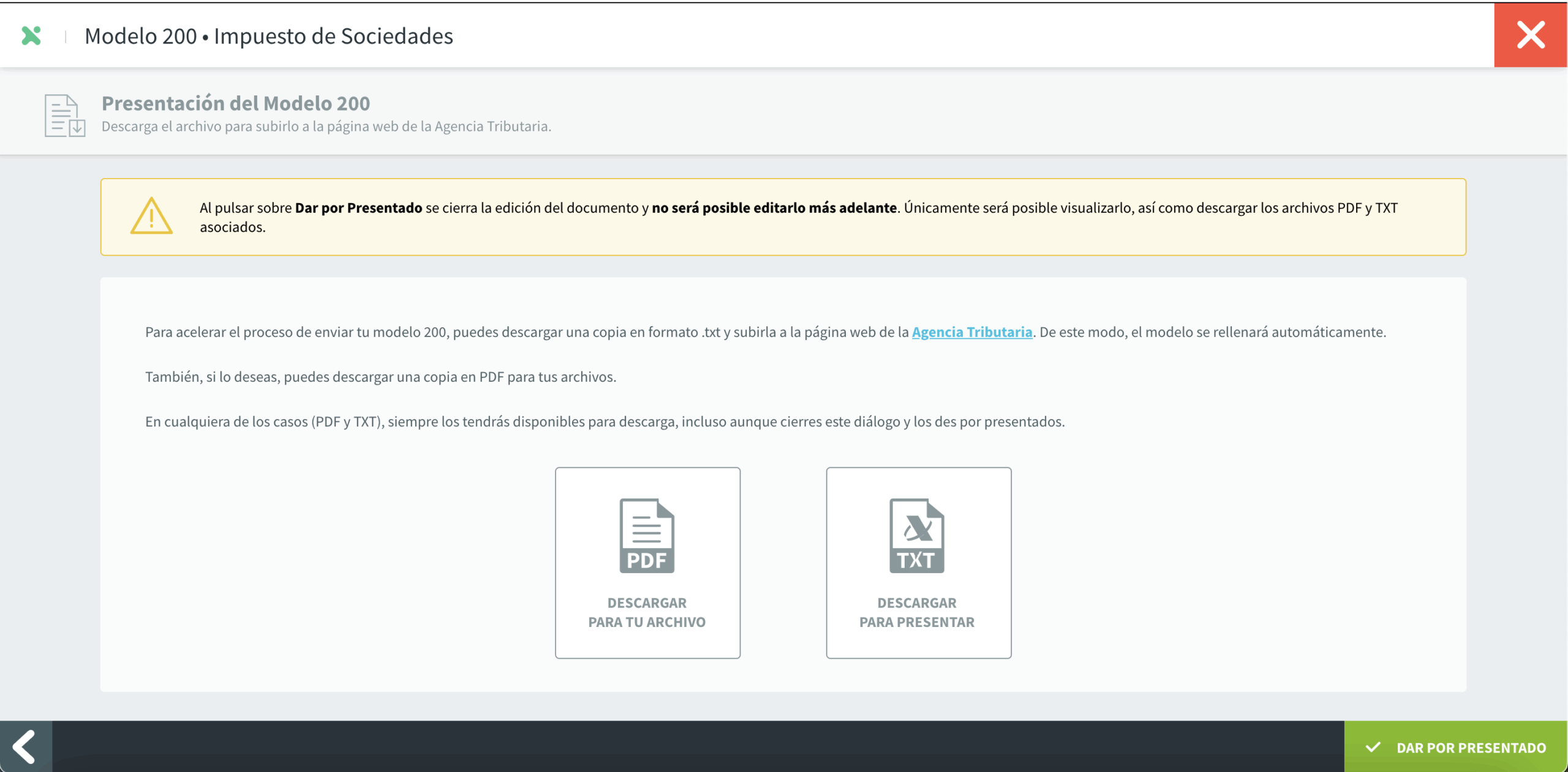 Una vez revisados los datos, pulsa en . Se abrirá una página en la que podrás descargar el archivo para la presentación del modelo ante la Agencia Tributaria, y también podrás descargar un PDF para tu archivo interno.