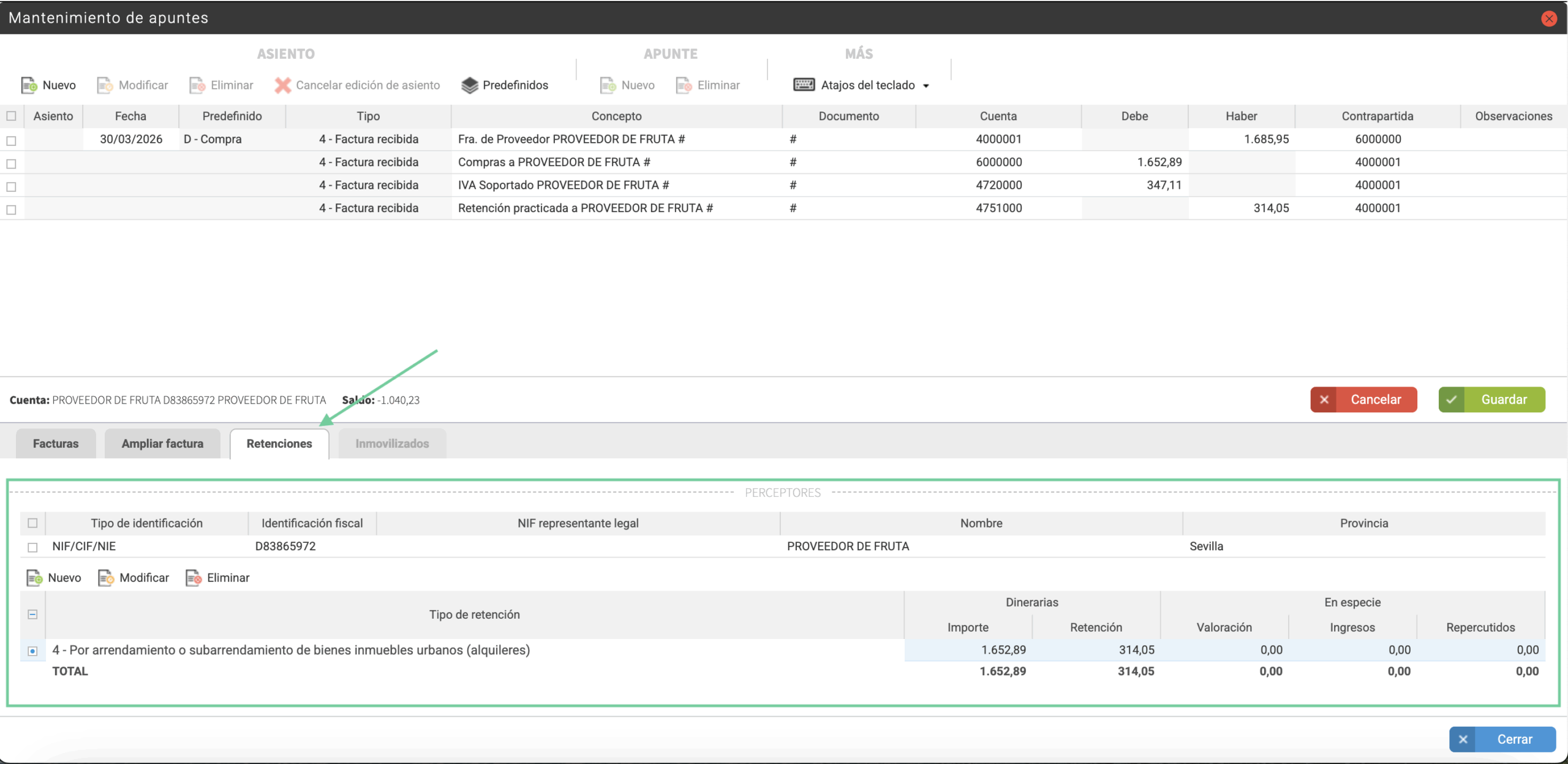 - Base de las retenciones e ingresos a cuenta (casilla 2): aquí tendrás la suma total de las Bases Imponibles, de todos los asientos que cuenten con retención del tipo alquiler. Esta información se lee de la pestaña de retenciones del asiento contable.