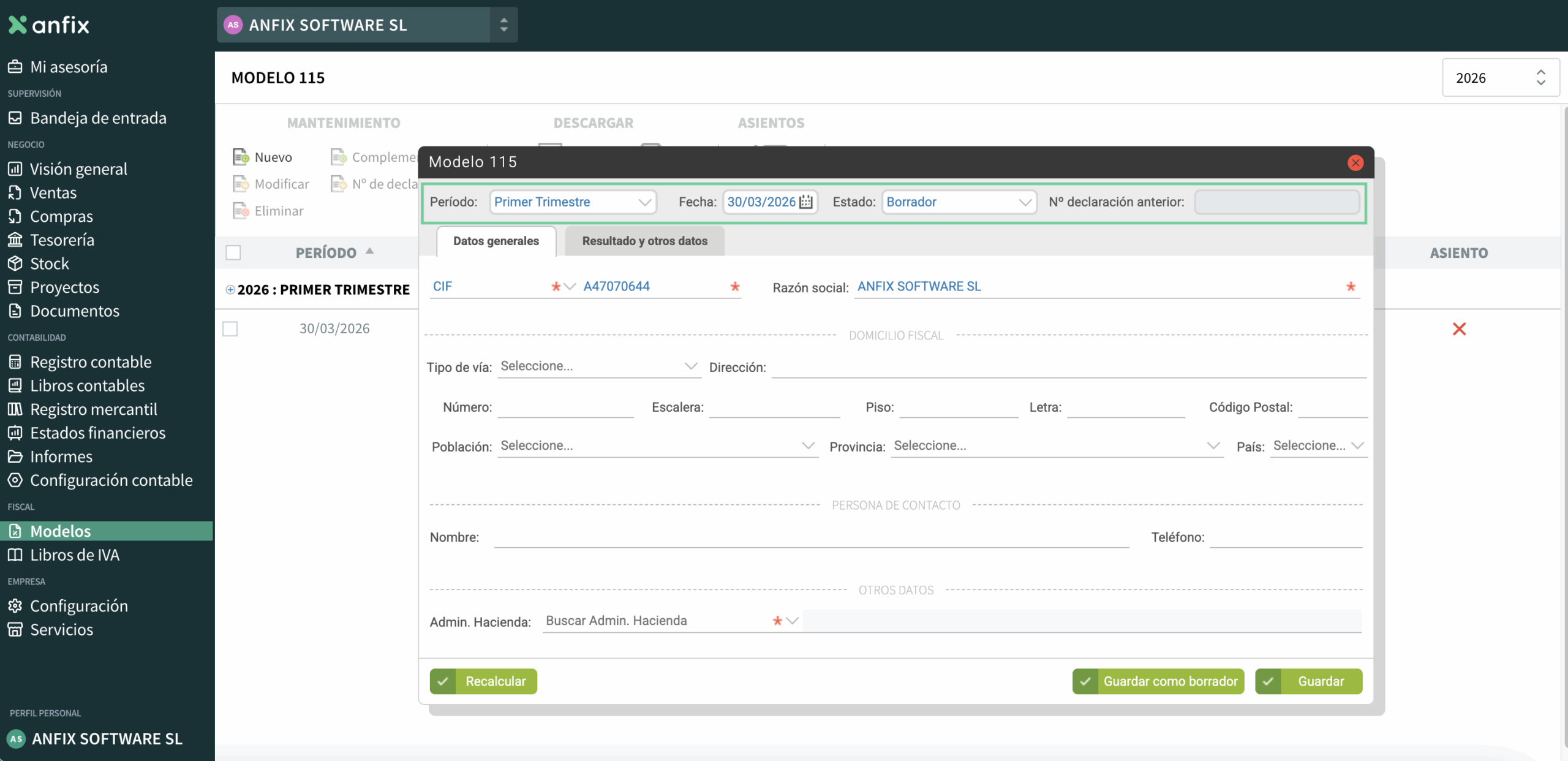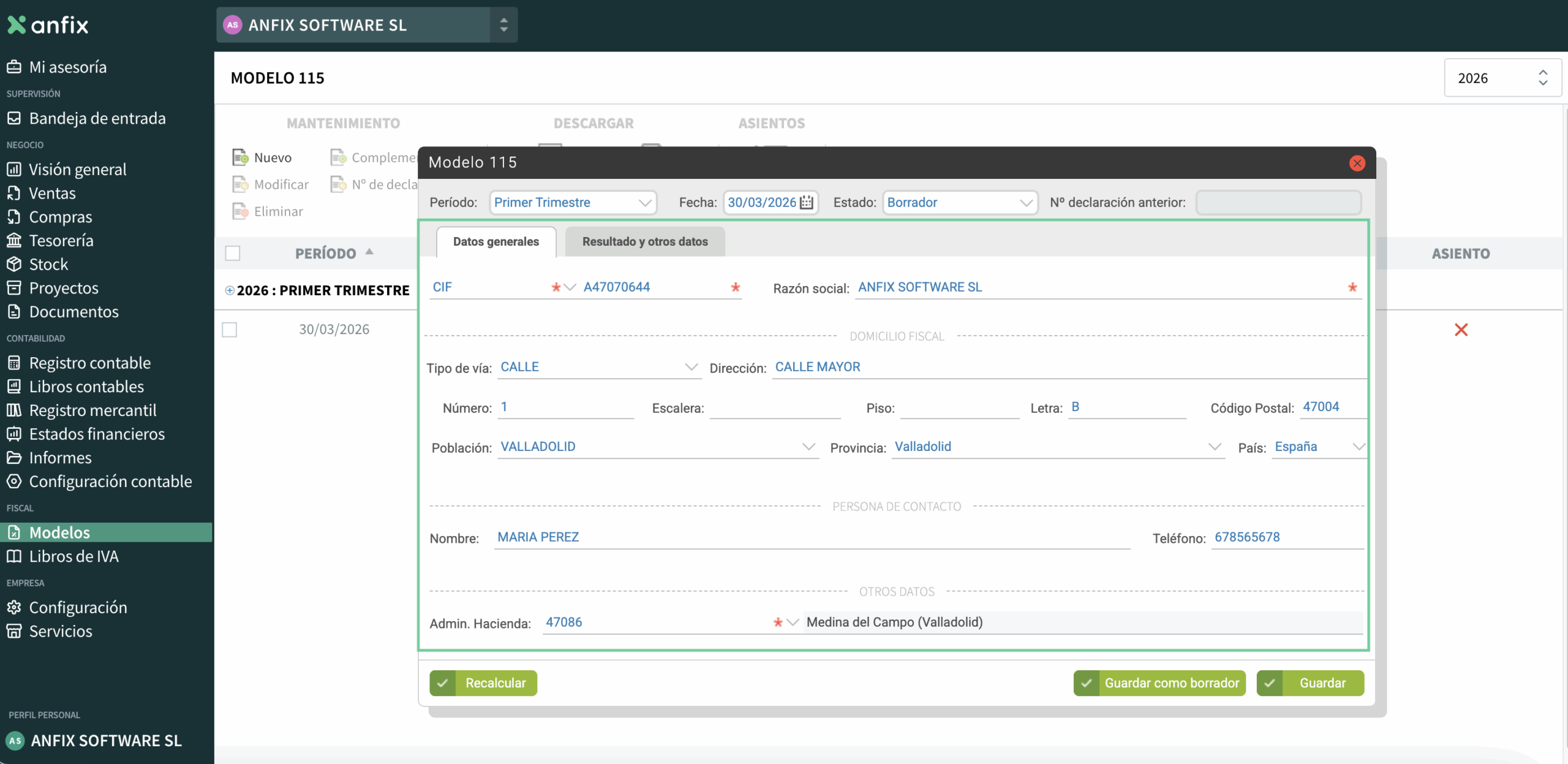 En la pestaña Datos generales se muestran los datos de la empresa: CIF, razón social, domicilio fiscal, persona de contacto y la Administración de Hacienda donde se presentará el modelo.