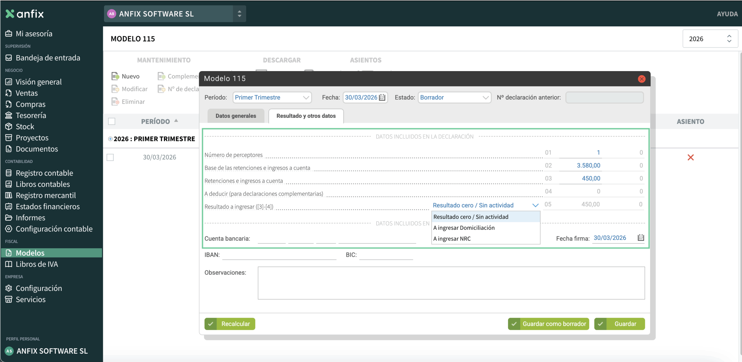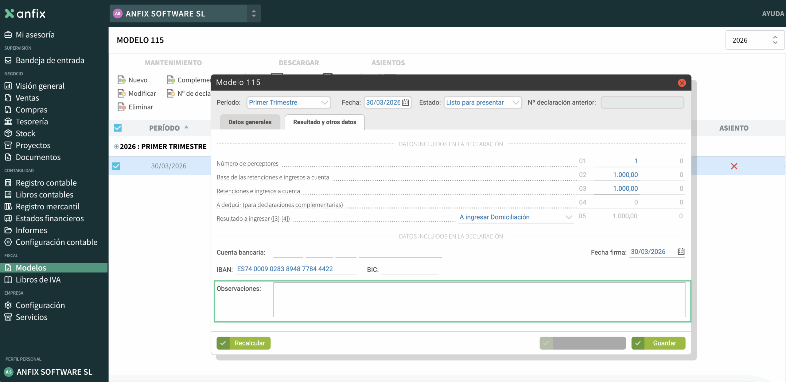 En Anfix, este modelo se completa con la información de los asientos contables de facturas recibidas que incluyen la retención correspondiente al alquiler, a partir de los datos del faldón de la factura, en la pestaña Retenciones.