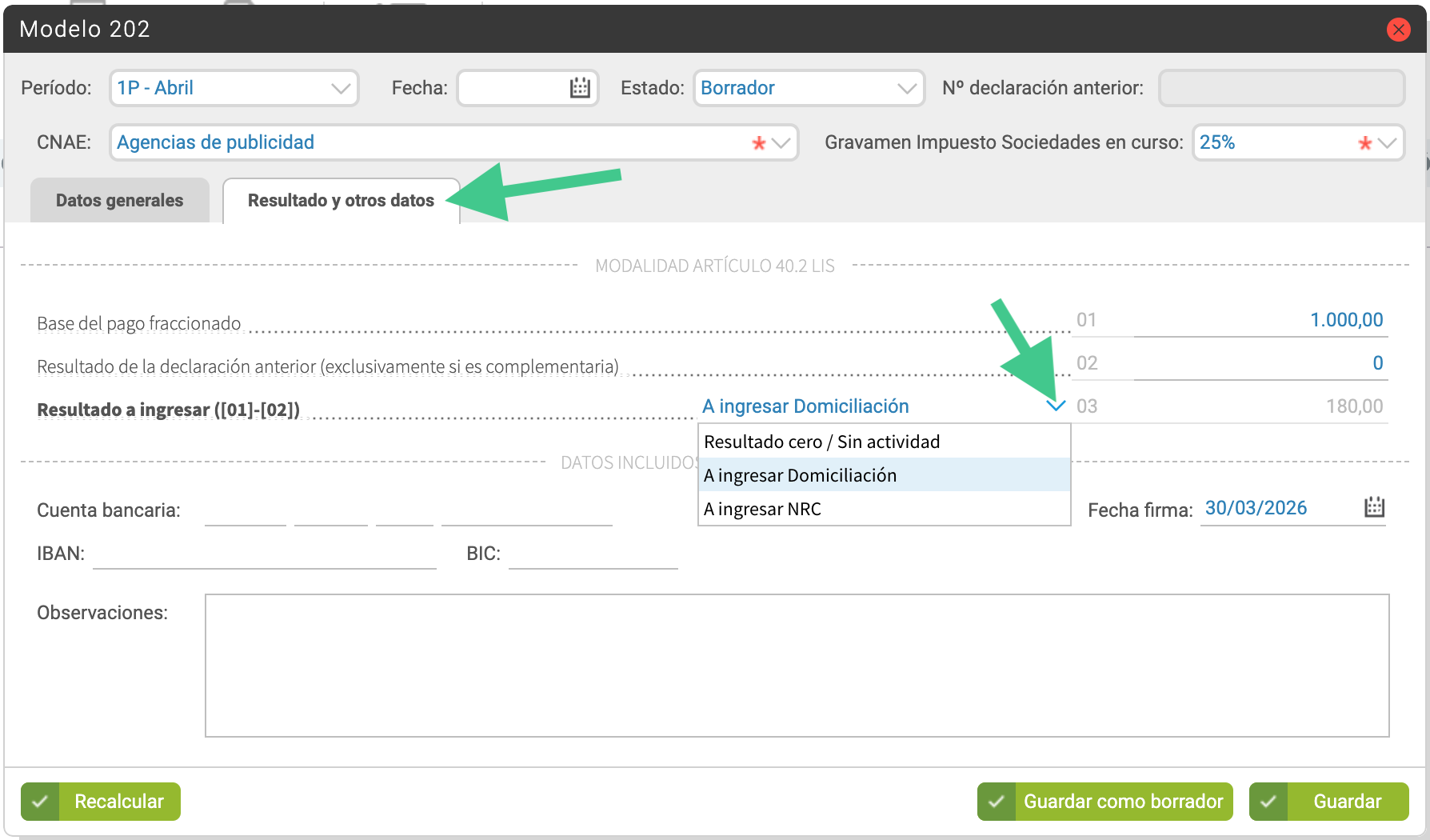 En la parte inferior también puedes revisar la cuenta bancaria, la fecha de firma —que por defecto propone la fecha actual y puede modificarse desde el calendario— y el campo Observaciones, donde puedes añadir información adicional al modelo.