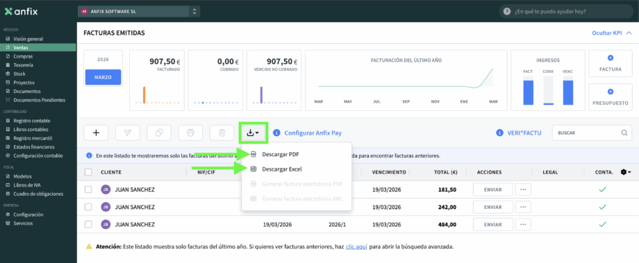 Descargar el listado desde Facturas emitidas