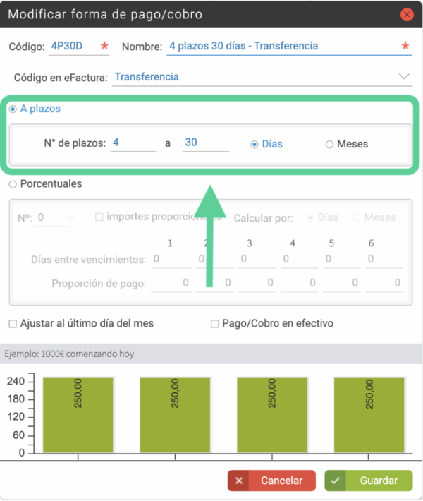 - Especifica, para cada vencimiento, cuántos días o meses deben pasar desde el vencimiento anterior. En el primer vencimiento, el plazo se cuenta desde la fecha de la factura.