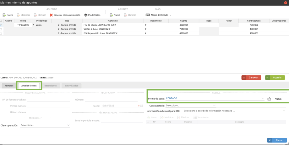 - Pago o cobro en efectivo: Si activas la opción Pago/Cobro en efectivo, el importe de la factura se reflejará como importe en metálico en el modelo 347.