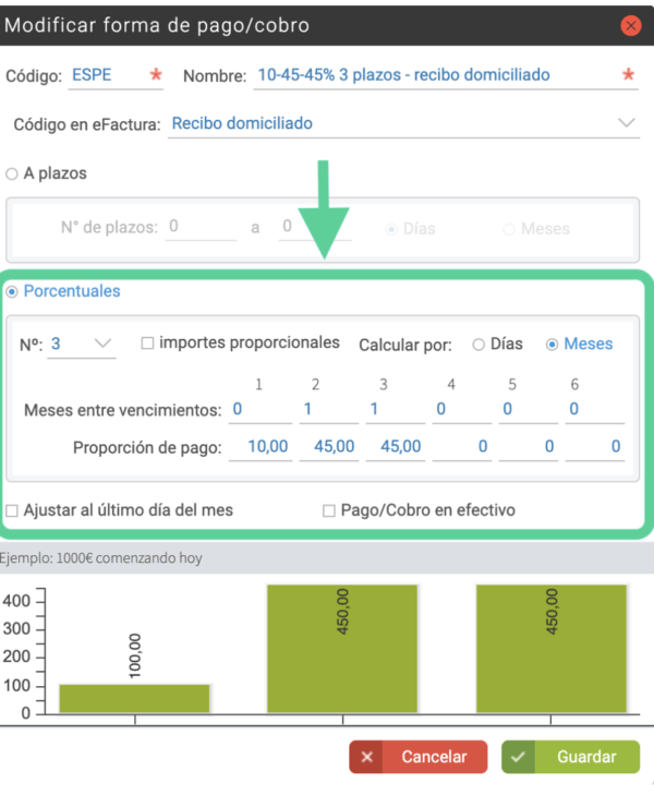 - Tipos de forma de cobro: debes indicar si la forma de pago será A plazos o Porcentual.
