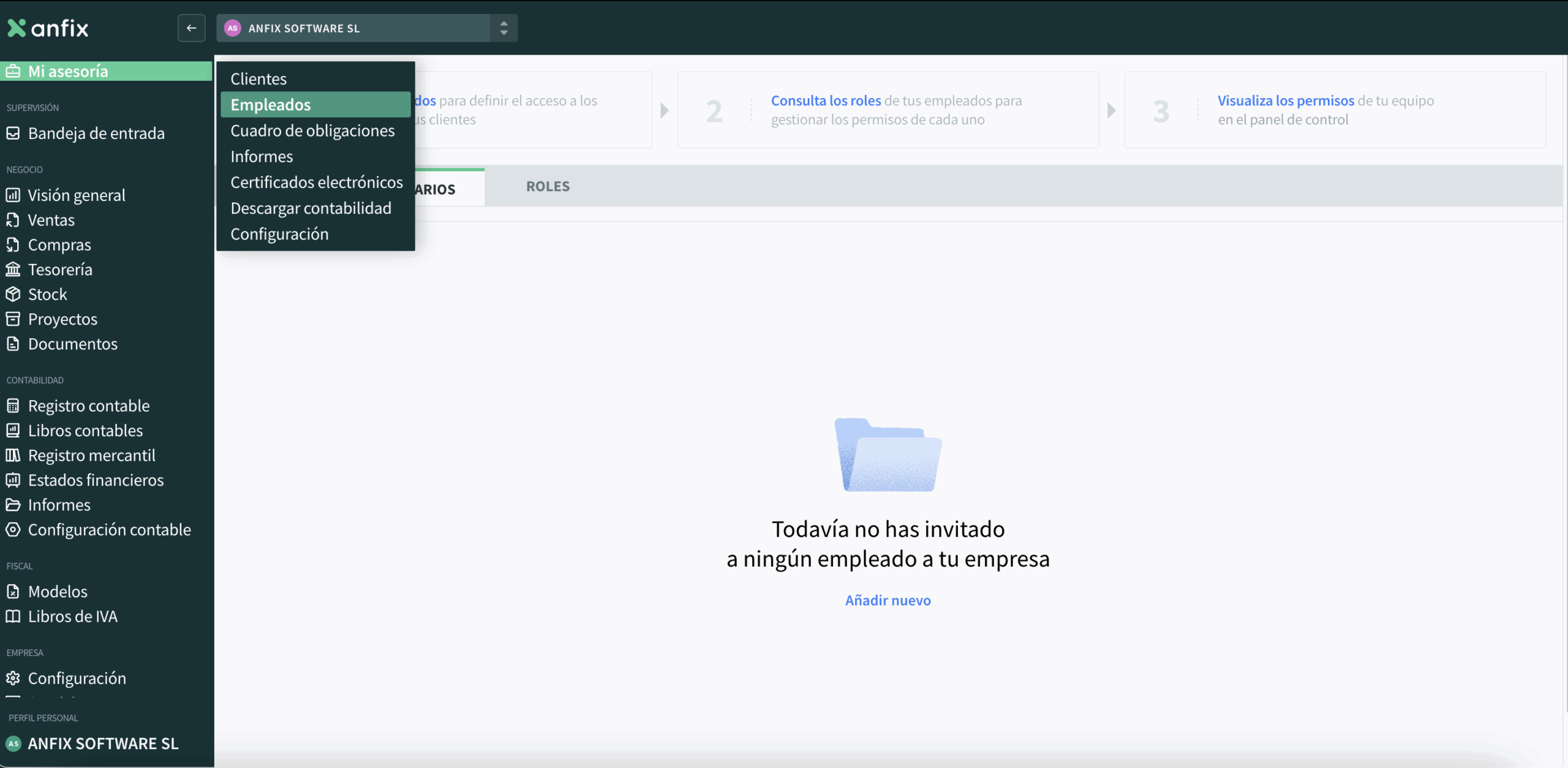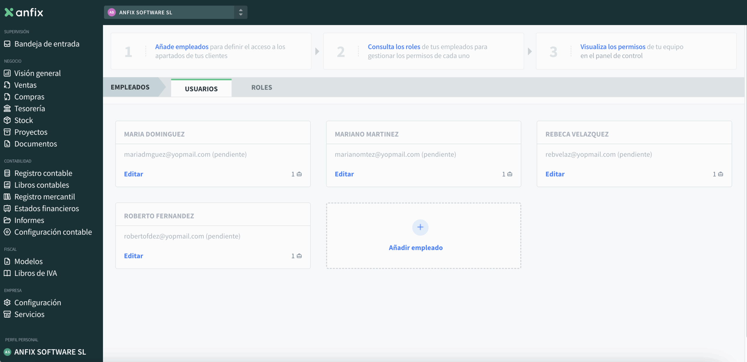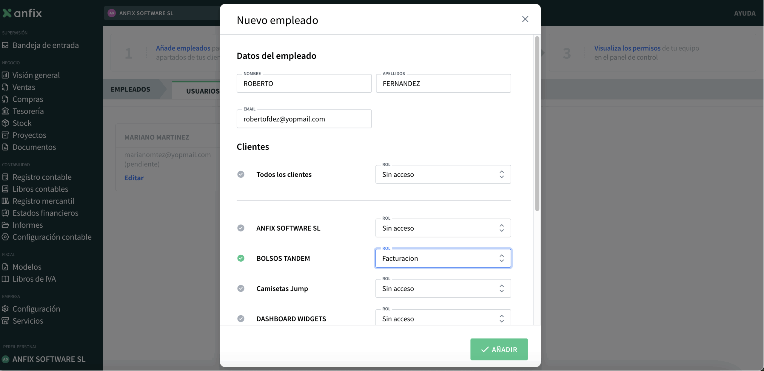 El empleado recibirá un correo solicitando que acepte el acceso a Anfix y aparecerá en el listado con el rol asignado y con estado pendiente de aceptación.