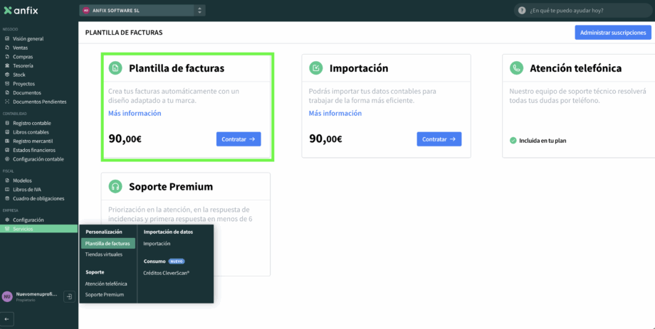 Si necesitas una plantilla con un formato específico, puedes contratar este servicio desde Empresa > Servicios > Plantilla personalizada.