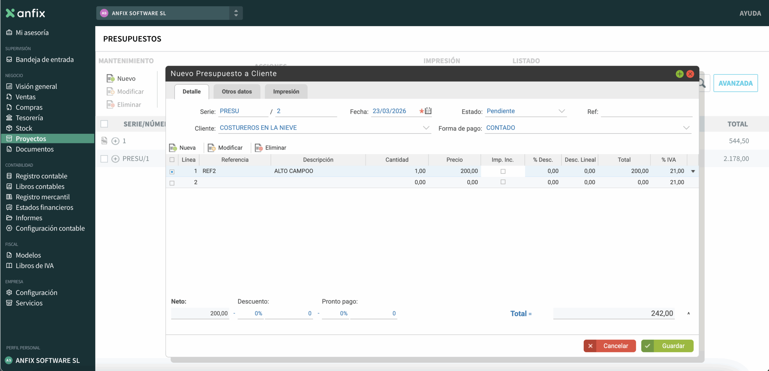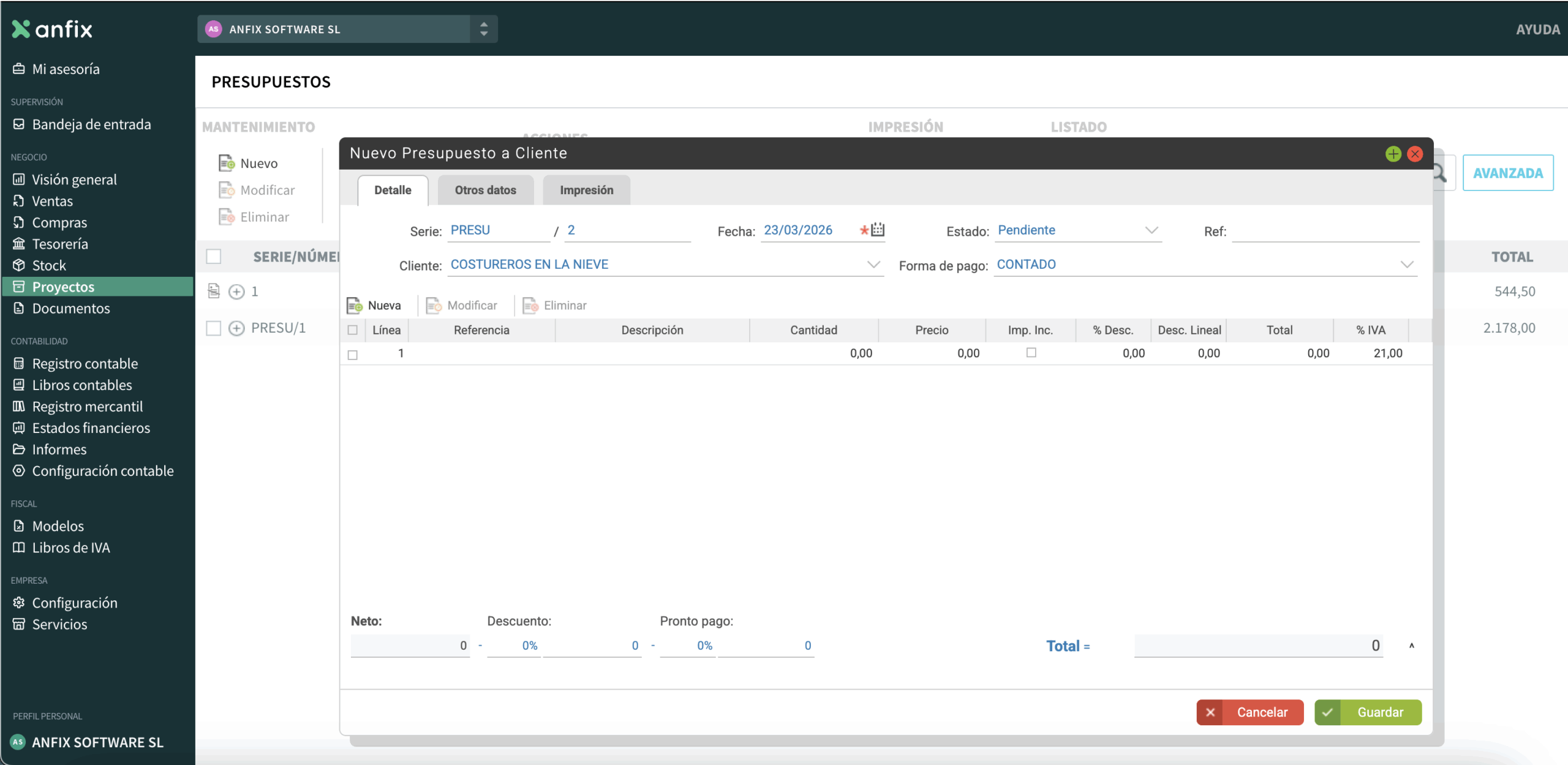 Con esta opción puedes crear un presupuesto dentro del módulo de Proyectos y, después, usarlo para generar el proyecto. Para hacerlo, primero debes tener dado de alta al cliente en anfix.