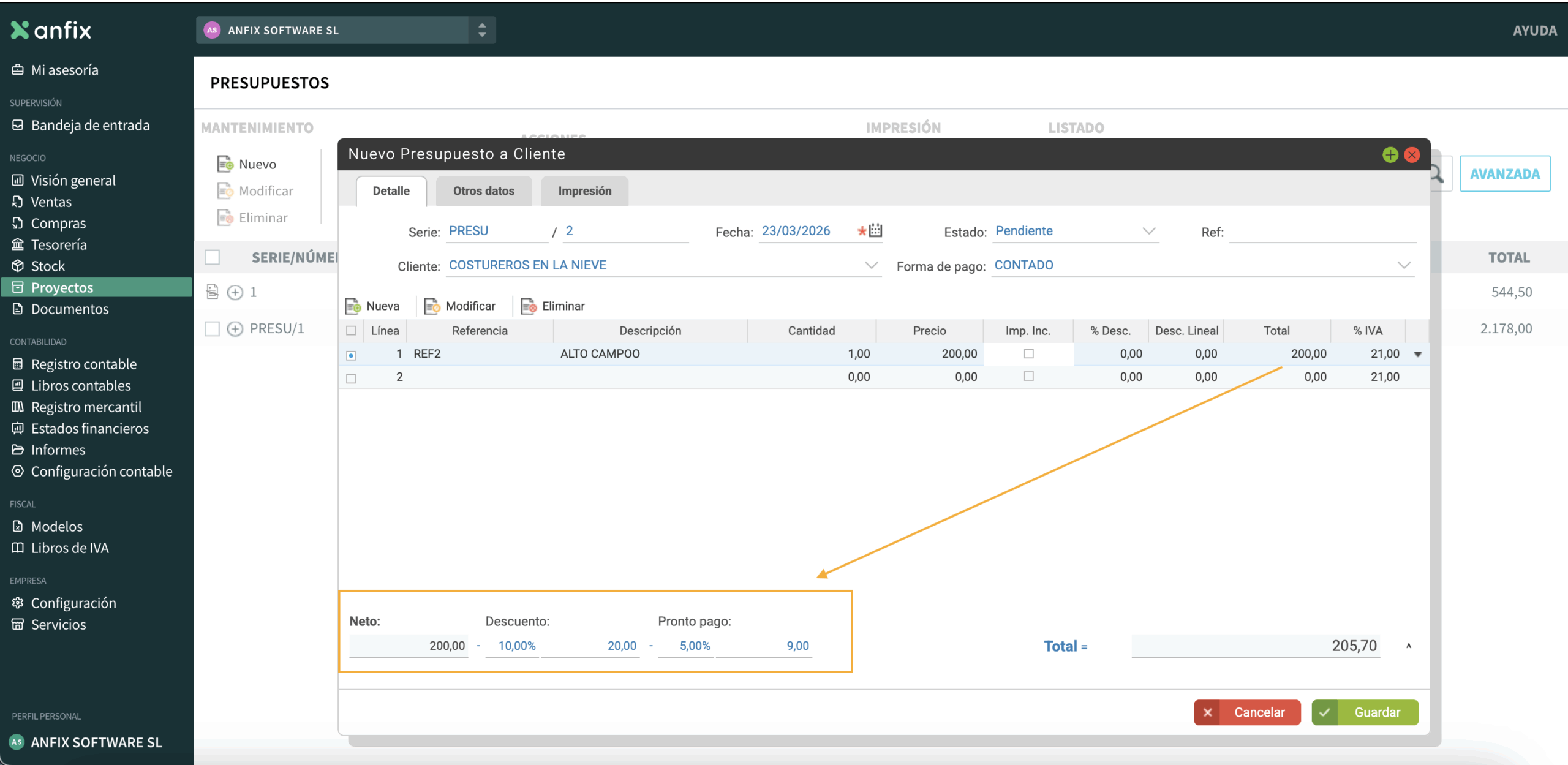 En la parte inferior izquierda del presupuesto podremos añadir descuentos: