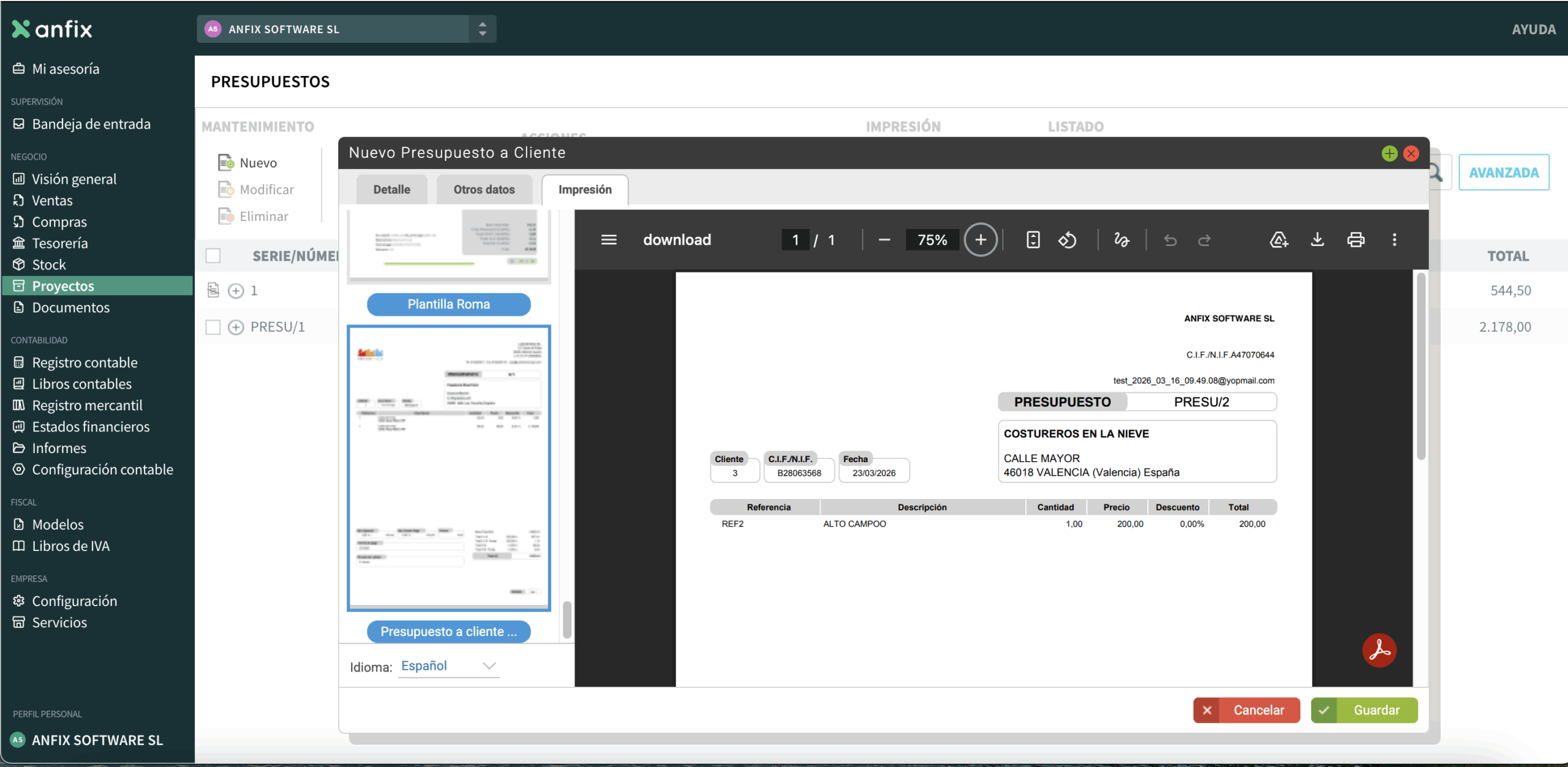 - Cliente: Lo seleccionaremos entre los creados en anfix. Para ver cómo crear uno pulsa aquí.