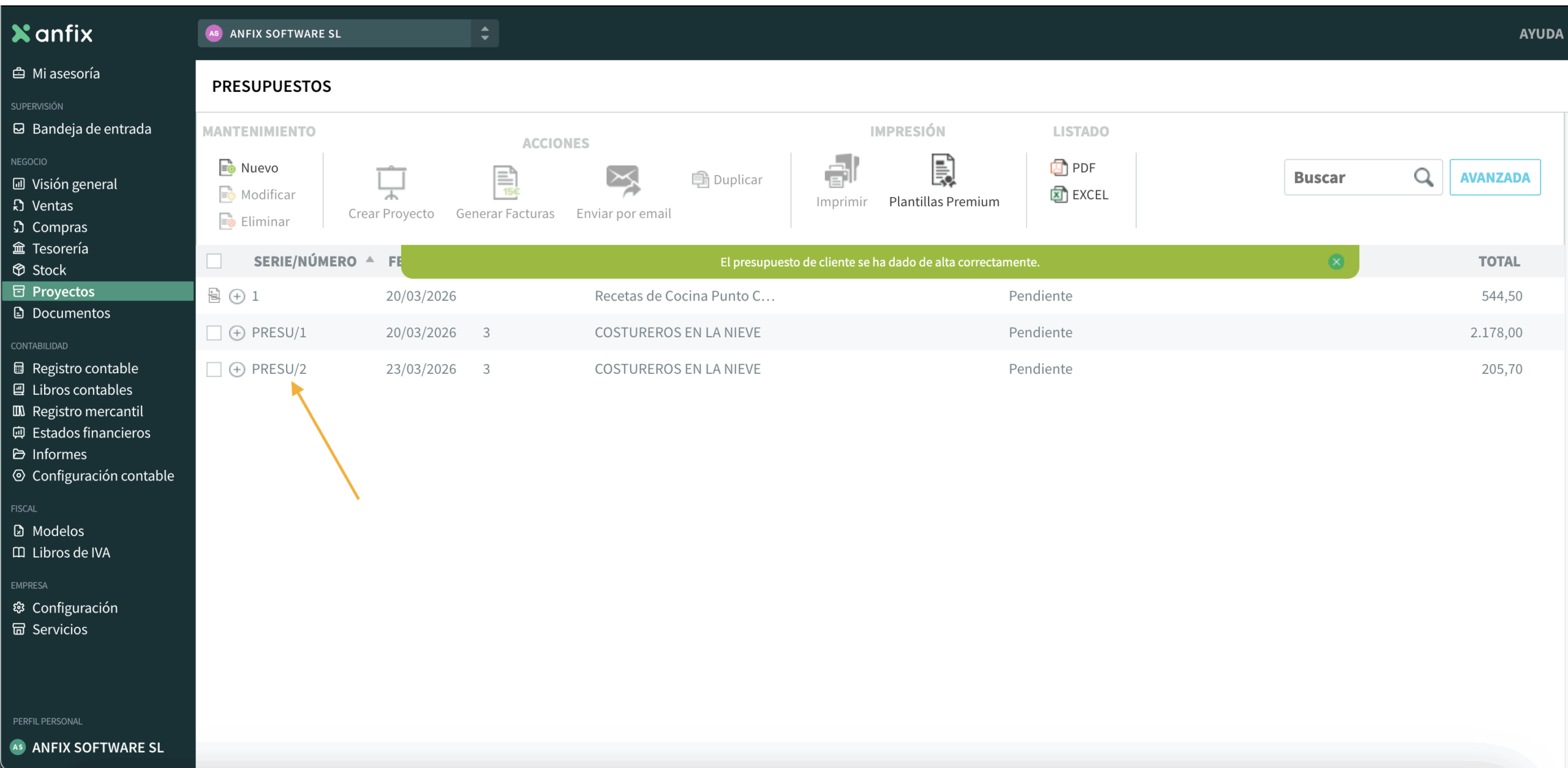 podremos ver el presupuesto en el listado, al cual podremos acceder más adelante desde PROYECTOS → PRESUPUESTOS: