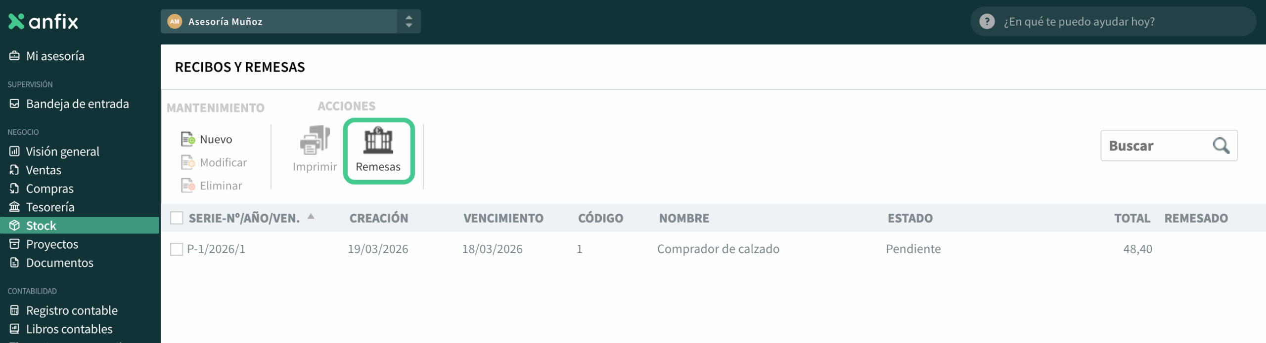 Una vez creados, los recibos aparecerán en Stock → Recibos y remesas. Desde ahí podrás modificarlos, eliminarlos o imprimirlos.